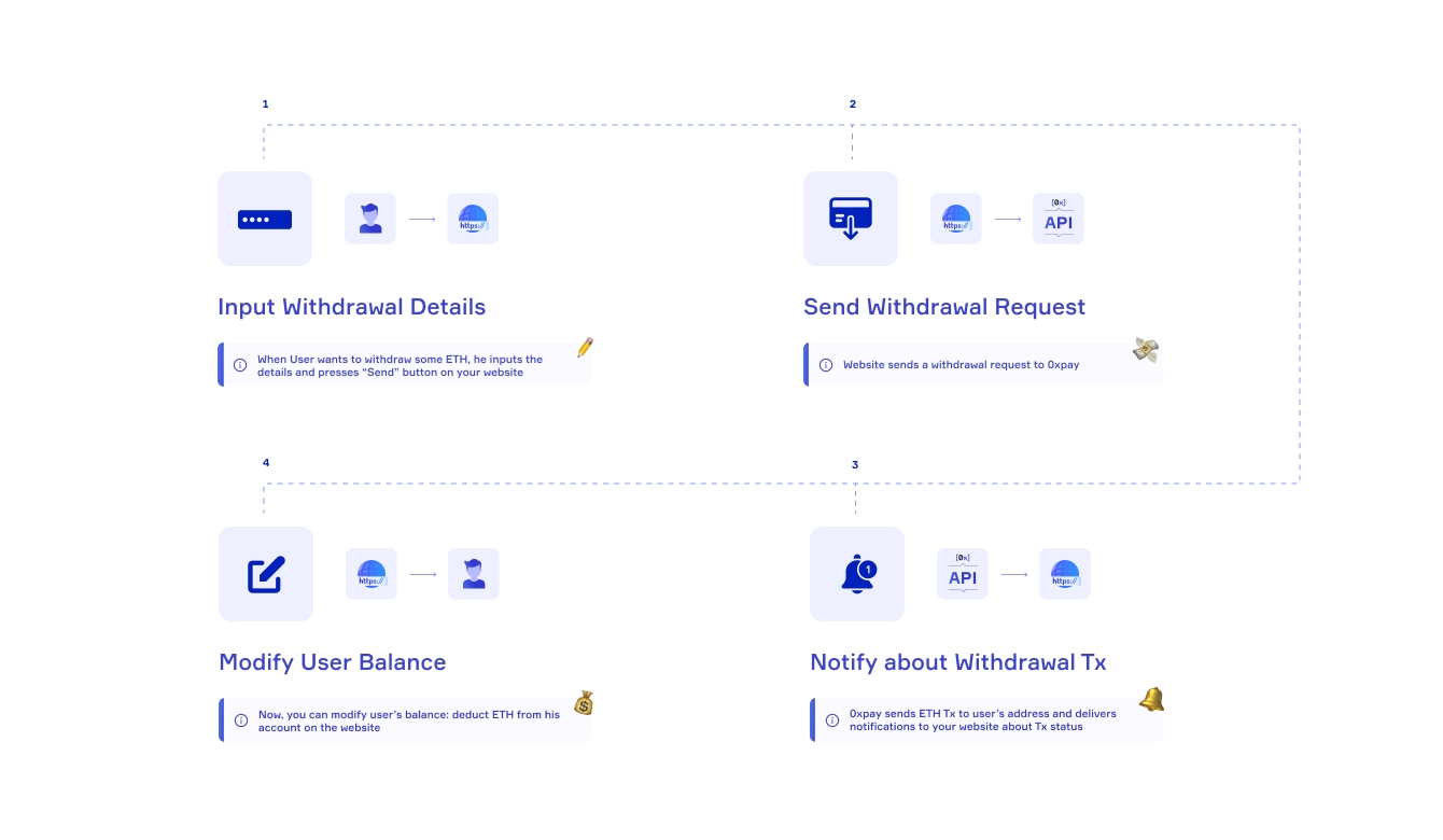 0xpay creates an outgoing transaction to the user's wallet address and provides notification callbacks to your platform, informing about the status of withdrawal.